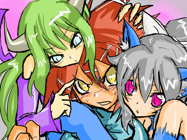 00s3girlsbat wingsdemon girlgreen eyesgreen hairhornsmultiple girlsorange hairpink eyesshort hairsketchwingsyellow eyes