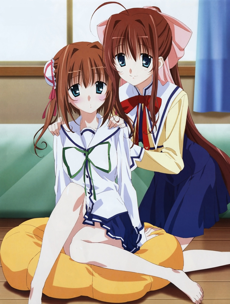 00sbarefootbedsideblushbrown hairbun coverdouble bungreen eyeslong hairschool uniformshort hairsiblingssisters