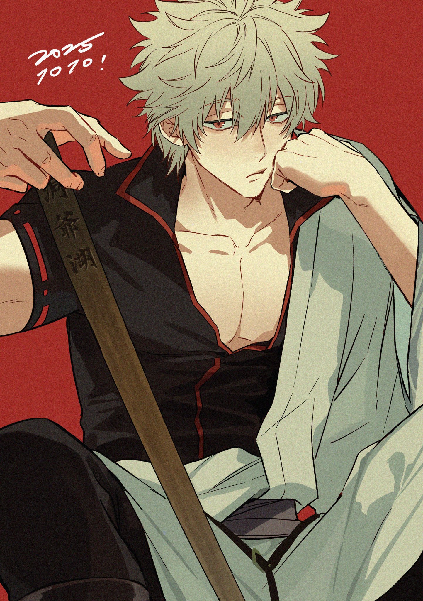 1boyblack shirtclosed mouthcollarbonecollared shirtdatedfilm grainfingernailsgrey hairhadanugi dousahair between eyeshead restjapanese clotheskimonolong sleevesmale focusopen kimonopartially open shirtred eyesred trimshirtshort sleevessittingsoloswordweaponwhite kimonowooden sword