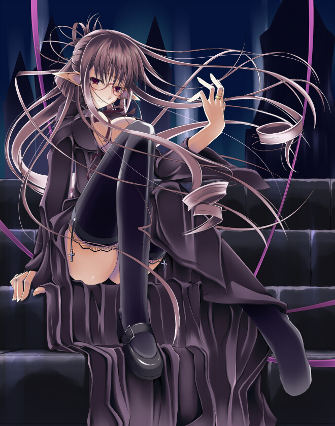 1girlbrown hairfemale focusglasseslong hairpointy earsred eyesshoessingle shoesittingsitting on stairssolostairsthighhighs