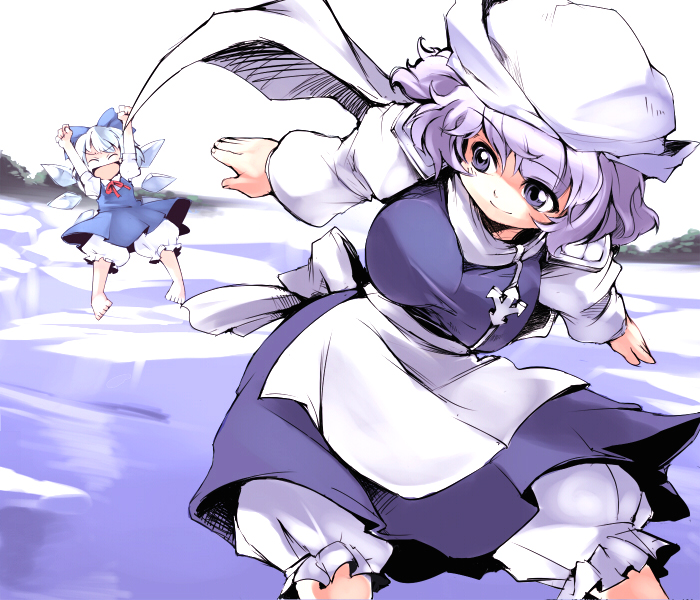 2girlsbloomersblue hairclosed eyesfemale focushatjumpingmultiple girlsopen mouthpurple hairribbonscarfshort hairsmileunderwearwhite bloomerswhite scarfwinter