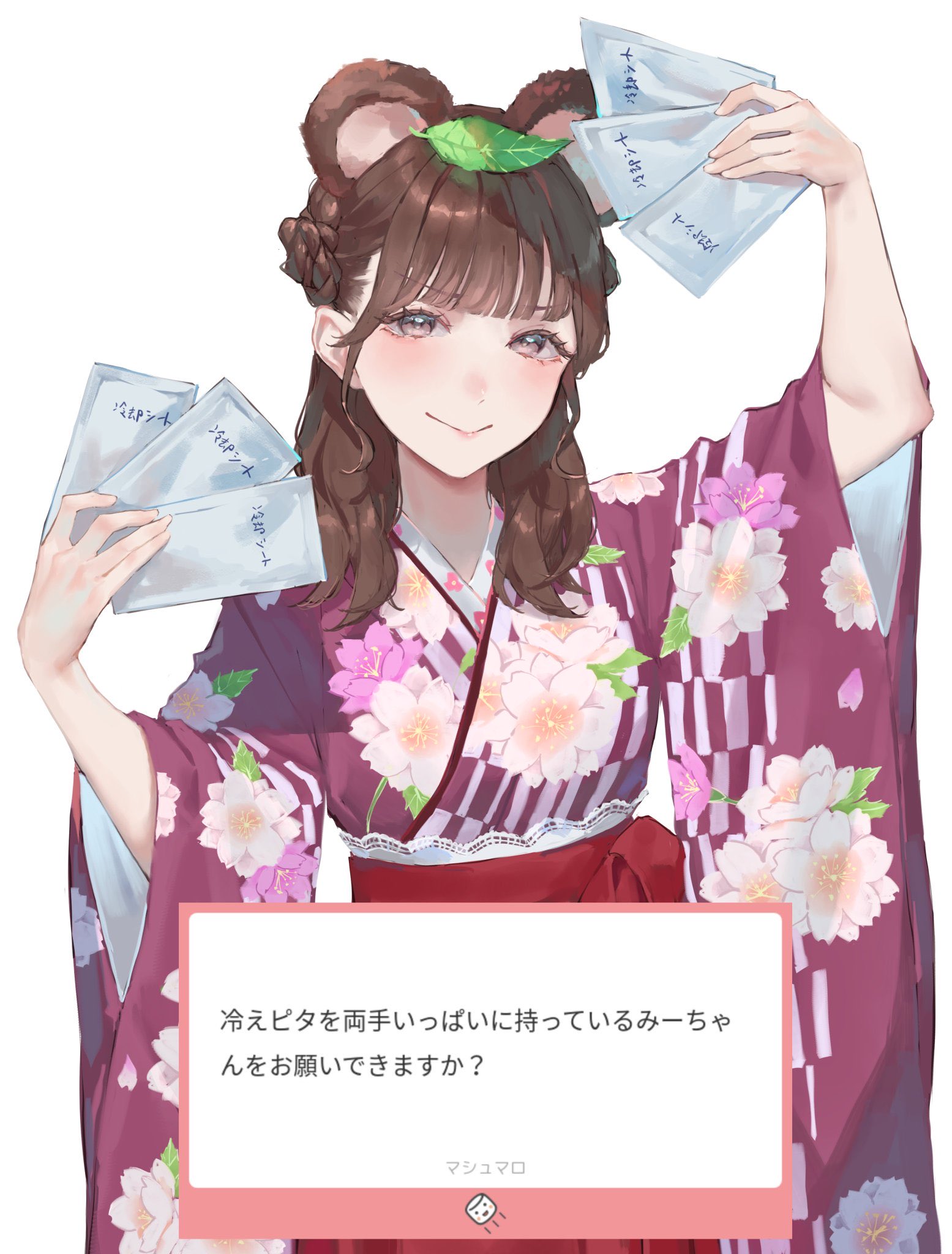 1girlanimal earsanimificationarm upblunt bangsbraidbraided bunbrown haircherry blossom printclosed mouthfloral printfloral print kimonofurisodehair bunholdingjapanese clotheskimonoleafleaf on headlong hairlooking at viewermarshmallow (site)miyake miuobiobiagepink kimonoprint kimonoraccoon earsred sashsashsidelockssimple backgroundsmilesolothree-quarter sleevesv-shaped eyebrowsvoice actorwhite backgroundwide sleeves