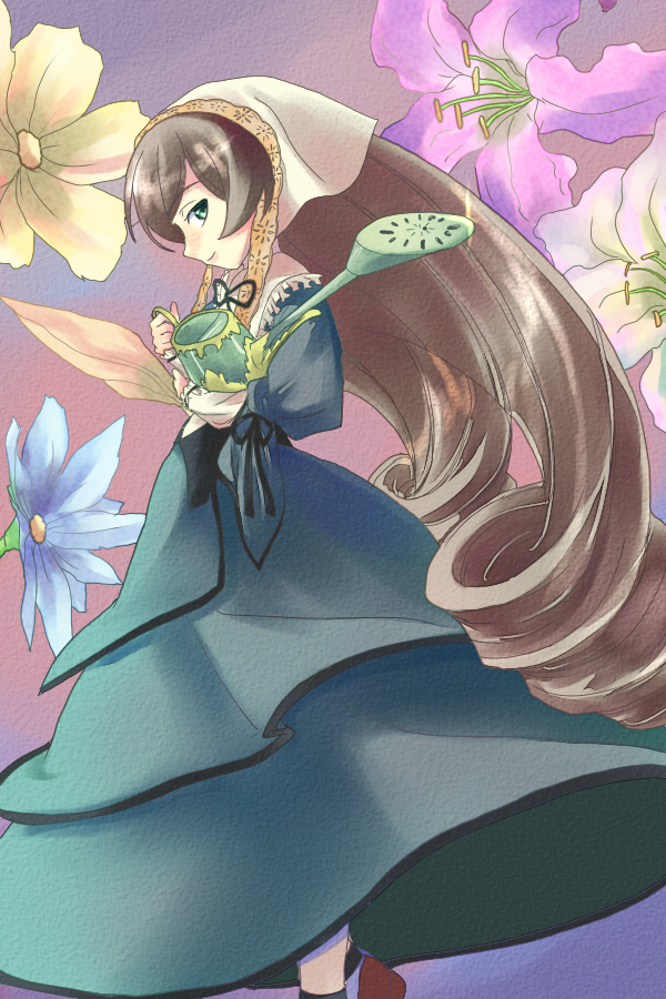 00sbrown hairdressdrill hairflowerhairbandheadscarfheterochromialong hairsolovery long hairwatering canwhite headscarf
