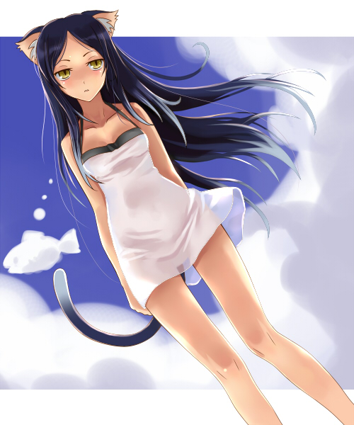 1girlanimal earsblue hairblushcat earscat tailfemale focuslegssee-through clothesslit pupilssolotailthigh gapyellow eyes