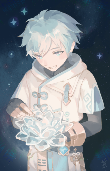 1boyblack glovesblue eyesfingerless glovesglovesgrinholding iceicemale focusnightshirtshort hairsmilesolosparklestar (sky)upper bodywhite shirt