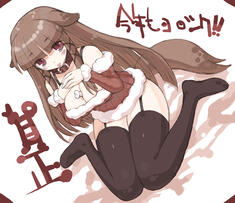 :p1girlanimal earsbetween breastsbreastsbrown eyesbrown haircleavagecollardog earsfemale focuslarge breastslong hairsolothighhighstonguetongue out