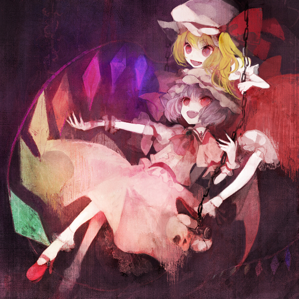 2girlsbat wingsblonde hairbobby socksfangfemale focusglowinghatmary janesmob capmultiple girlsnail polishon swingopen mouthoutstretched armpurple hairred eyesribbonshoesshort hairsiblingssisterssmilesocksswingwings