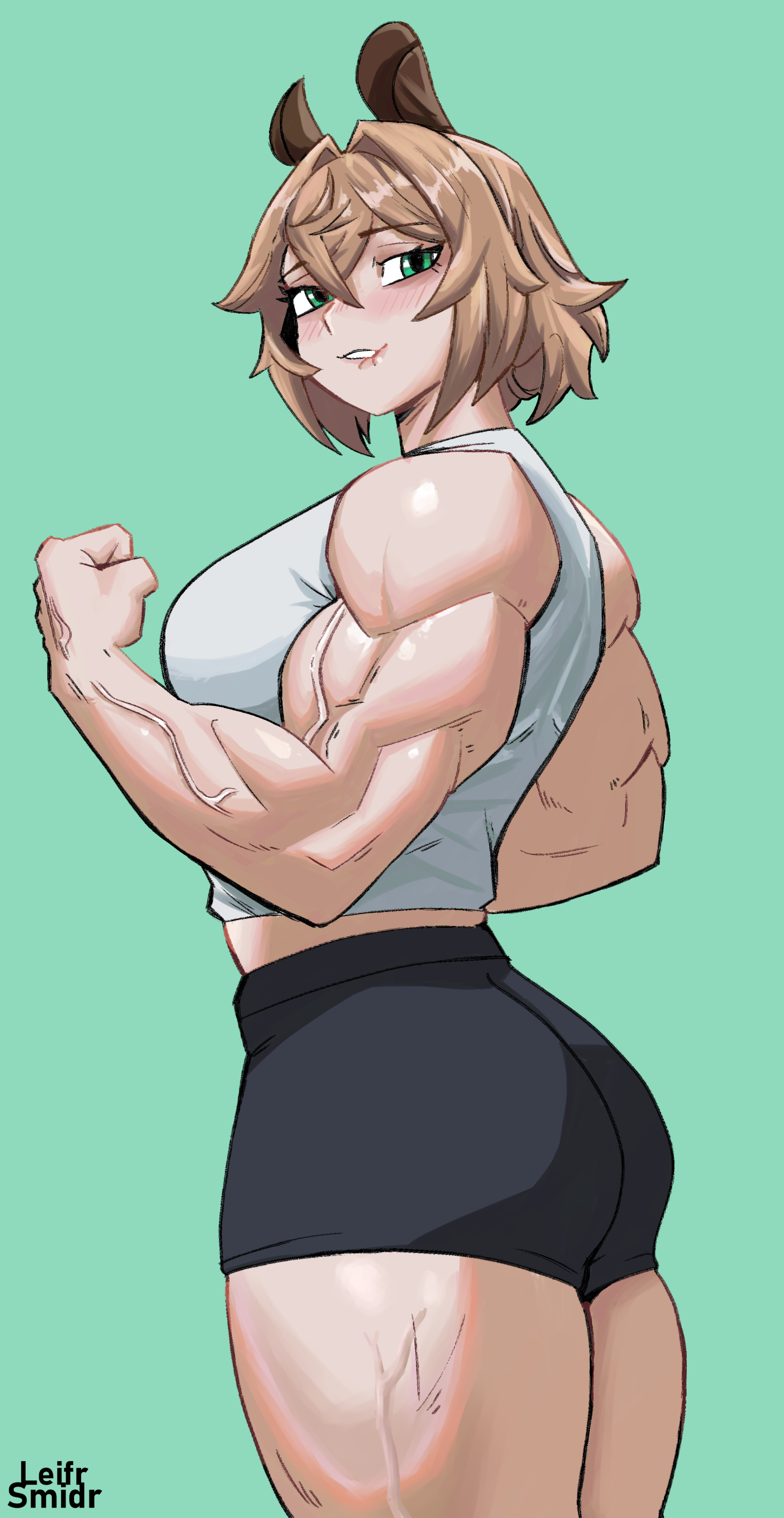 1girlanimal earsartist namebicepsbiting own lipblack shortsblushbrown hairclenched handflexinggreen backgroundgreen eyesleifr smidrlooking at viewermedium hairmuscularmuscular femaleshortssimple backgroundsmiletank toptapir earstapir girlveinsveiny armswhite tank top