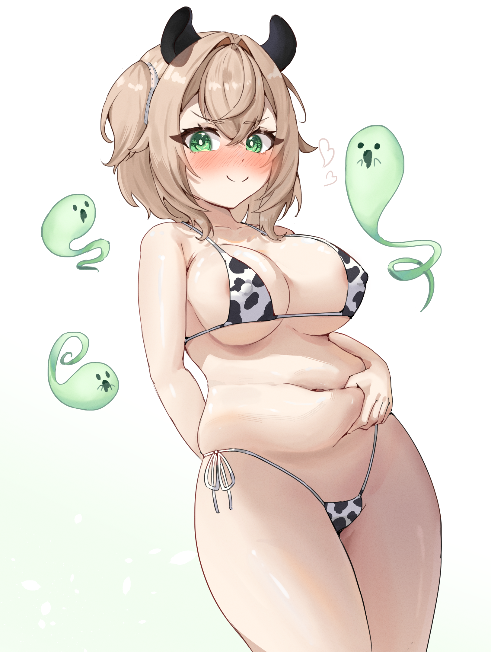 1girl3othersalternate costumeanimal earsanimal printbaku earsbikiniblushbreastsbrown haircleavageclosed mouthcow printcow print bikinicropped legscrossed bangsgrabbing own stomachgreen eyeshair between eyeshair intakeslarge breastslooking at viewermedium hairmultiple othersplumpprint bikinisimple backgroundsmilestandingswimsuitvirtual youtuberwhite background