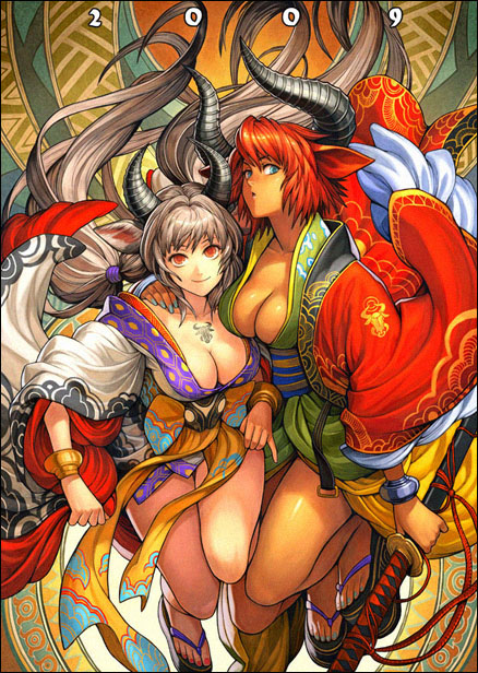 2girlsanimal earsblue nailsbreastscleavagefox earshornsjapanese clotheskimonomultiple girlsnail polish