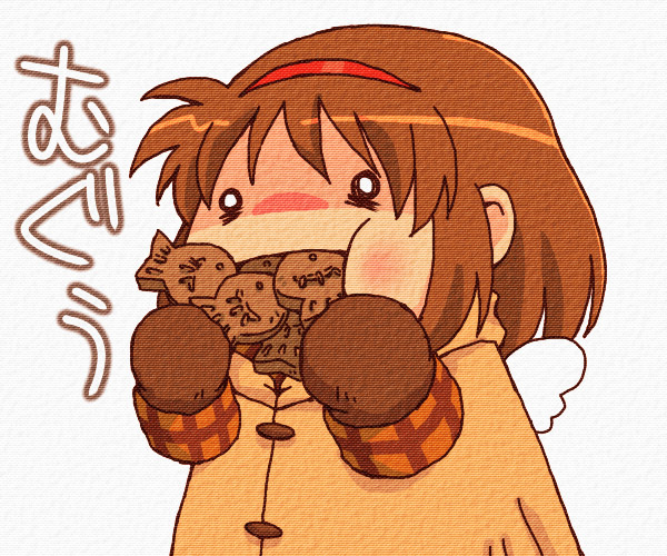 1girlchibicoateatingfemale focusfoodfull mouthhairbandmittenso oorange hairpunsolotaiyakiuguu~wagashiwings
