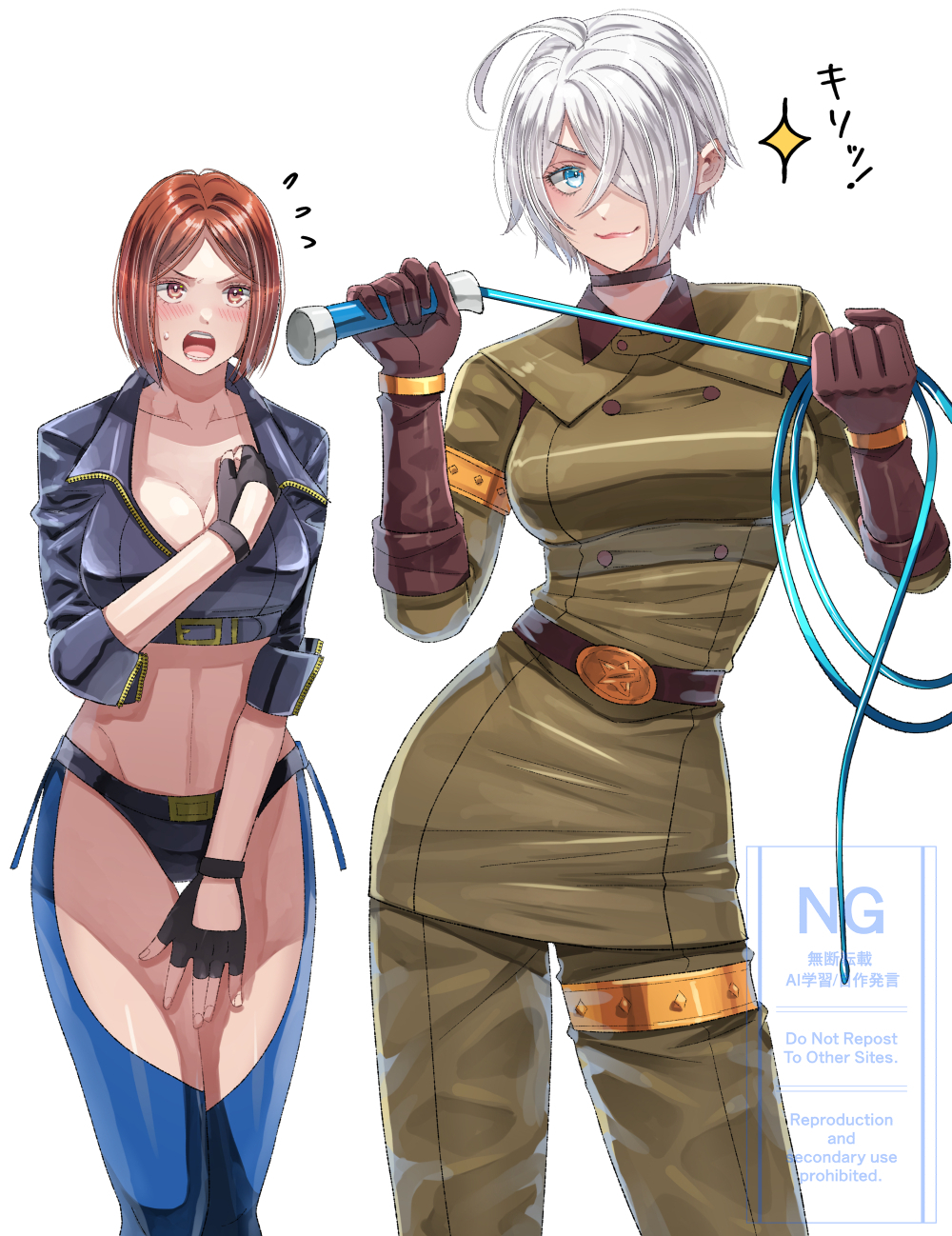2girlsbackless pantsbeltblue eyesblushbrabreastsbrown eyesbrown hairchapschokercleavagecosplaycostume switchembarrassedfingerless glovesglovesholdingholding whipjacketjewelrylarge breastsleatherleather jacketlooking at viewermilitarymilitary uniformmultiple girlsnavelopen mouthpantsshort hairsimple backgroundsmilestraplessstrapless bratonedtoned femaleunderwearwhipwhite background