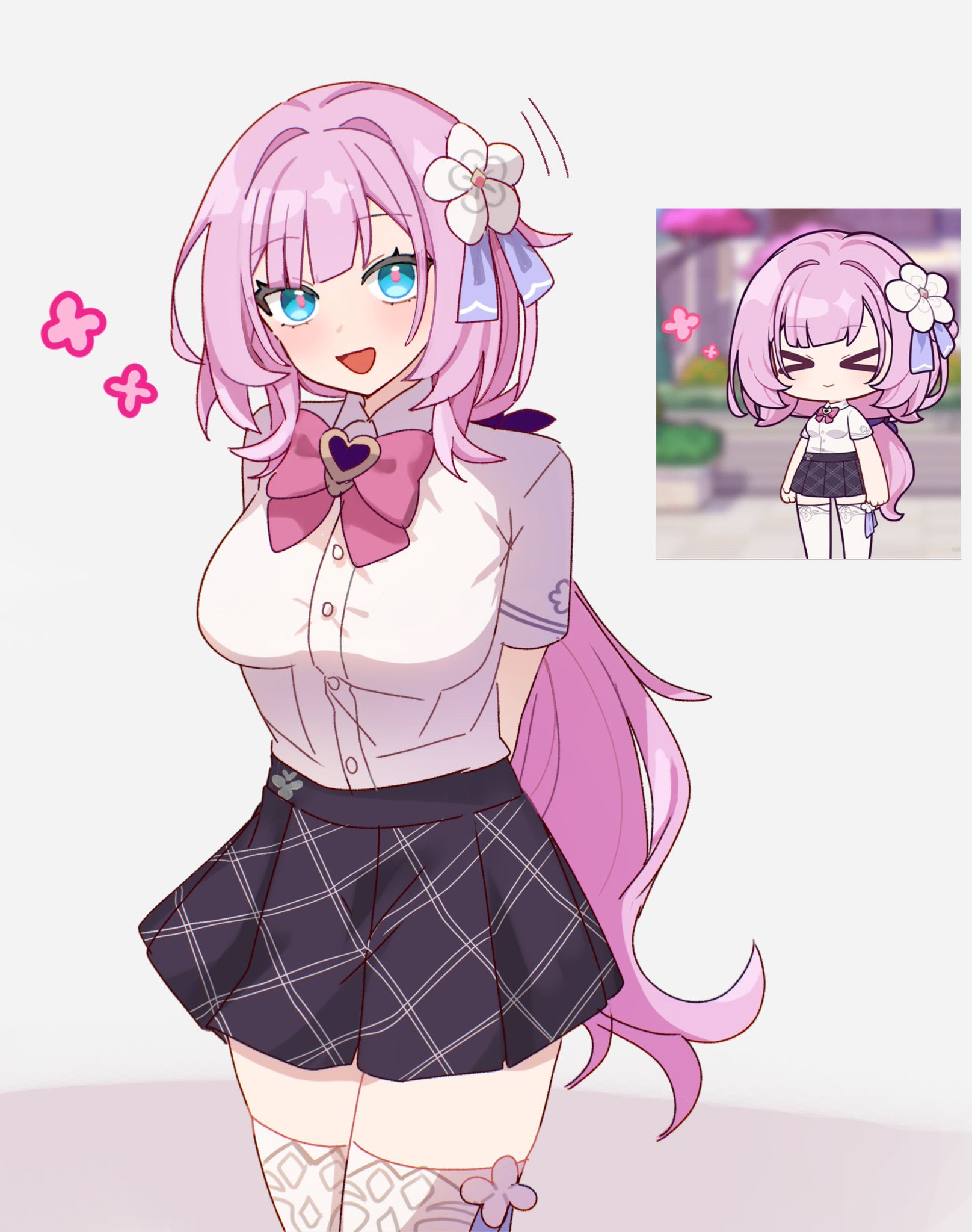 1boy1girlblack skirtblue eyesbreastsflowergame screenshot insethair flowerhair ornamentlarge breastslong hairlooking at viewerminiskirtofficial alternate costumeopen mouthpink hairreference insetshirtsimple backgroundskirtsmilesolothighhighsthighsvery long hairwhite backgroundwhite shirtwhite thighhighs