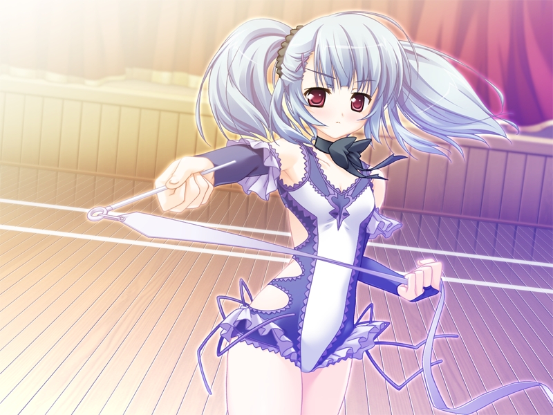 1girlblue hairblushbowchokerdetached sleevesdutch angleelbow glovesfemale focusglovesgymnasticsleotardlong hairred eyesrhythmic gymnasticsribbonribbon batonsolotwintails
