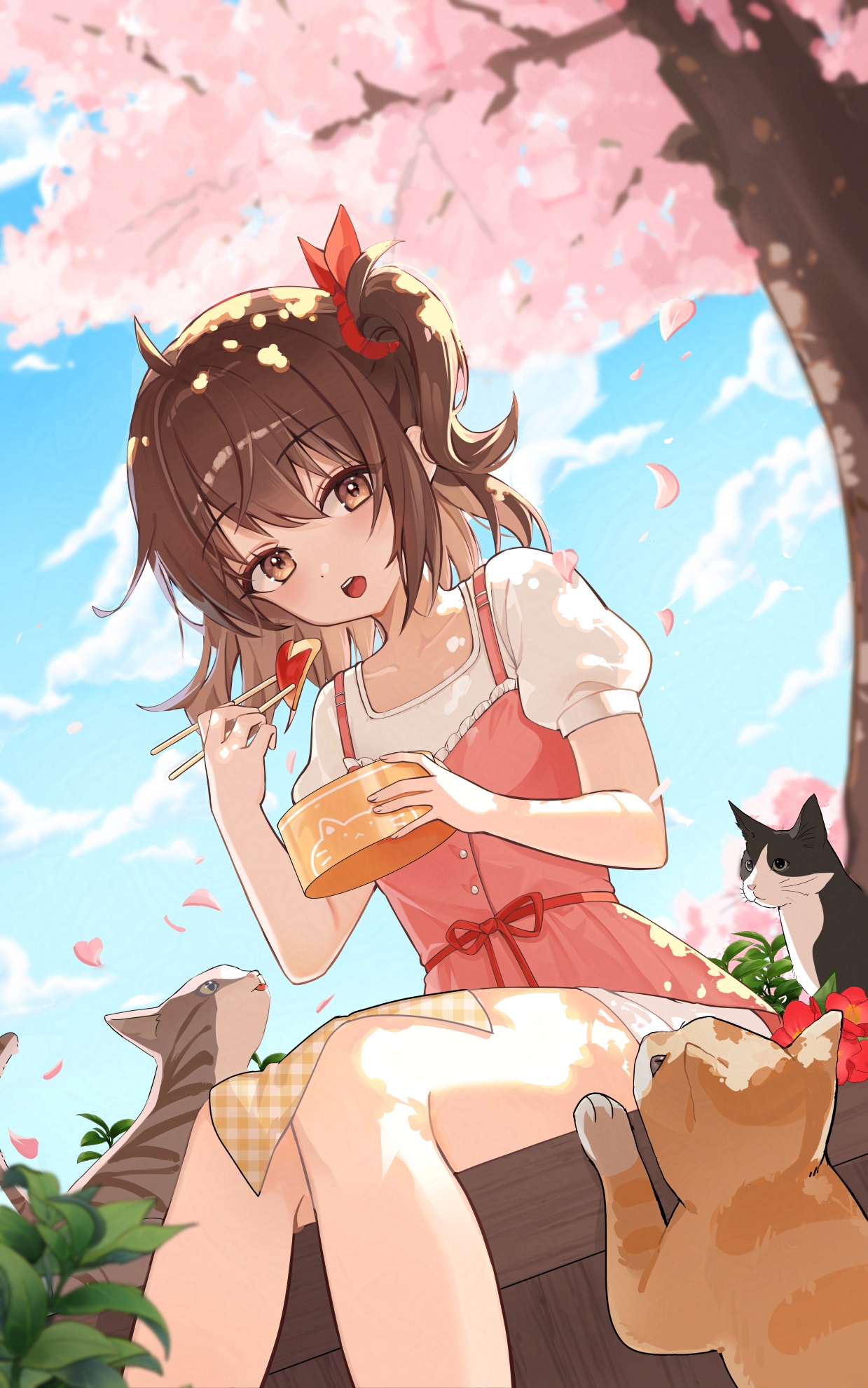 ar-khey, chisaka airi, dizzy dokuro, phase connect, absurdres, commentary, english commentary, highres, 2girls, animal ear fluff, animal ears, bandeau, bare shoulders, bed sheet, bikini, black bandeau, black bikini, blue hair, blush, breast press, breasts, brown hair, brown nails, cleavage, closed mouth, collarbone, colored inner hair, double bun, earrings, eyelashes, fingernails, floral print, green eyes, hair between eyes, hair bun, hair intakes, hair ornament, hair petal, hairclip, hairpin, holding hands, interlocked fingers, jewelry, large breasts, long fingernails, long hair, looking at viewer, lying, micro bikini, multicolored hair, multiple girls, multiple hairpins, on side, parted lips, pink hair, pink nails, pointy ears, ponytail, red eyes, red rope, rope, sideboob, sidelocks, skindentation, slit pupils, smile, strapless, strapless bikini, streaked hair, swimsuit, symmetrical docking, underboob, upper body, virtual youtuber, white bikini, wolf ears, wolf girl