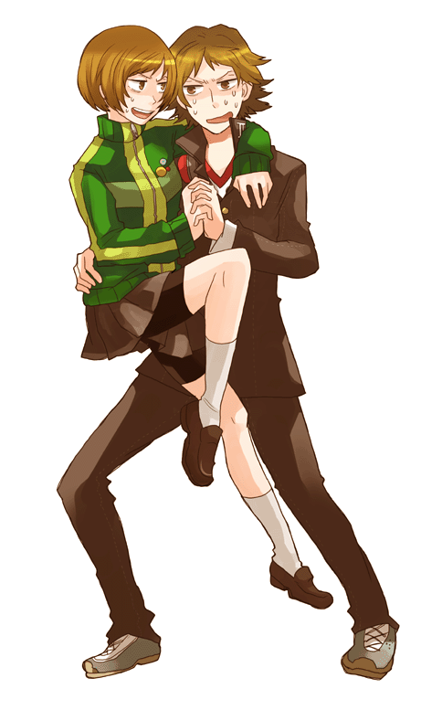 1boy1girlbrown eyesbrown hairschool uniformshort hairsimple backgroundskirtsweatwhite background