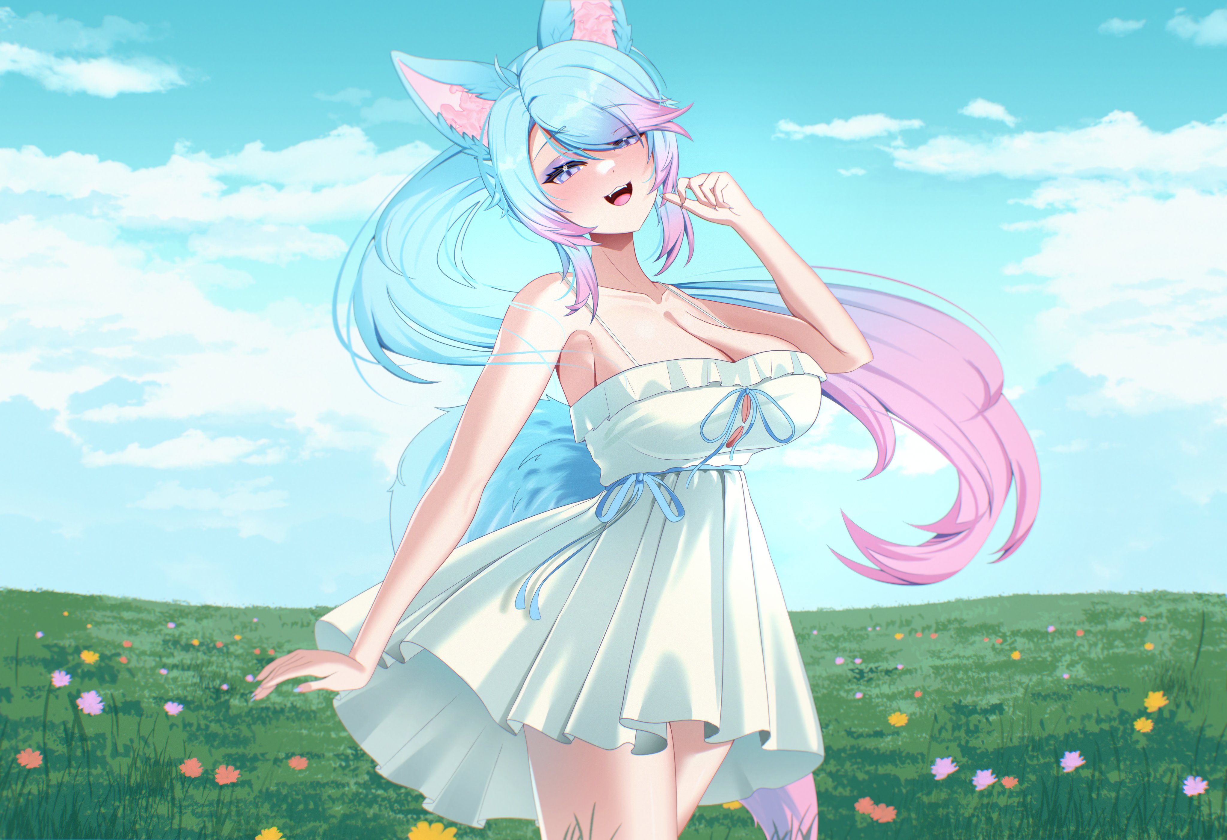 1girlanimal earsarm upblue hairblue ribbonbreastscleavagecloudcowboy shotdresseyeshadowfangsfieldfingernailsflowergradient hairgrasshead tilthigh-low skirtlarge breastslong hairlooking at viewermakeupmulticolored hairopen mouthorange floweroutdoorsparted bangspink hairpleated dresspurple eyespurple eyeshadowpurple flowerred flowerribbonskysleevelesssleeveless dresssmilesolostandingtailteethupper teeth onlyvery long hairvirtual youtuberwhite dresswolf earswolf girlwolf tail