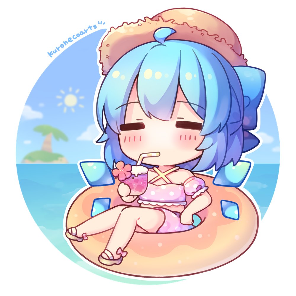1girlahogeartist namebikiniblue bowblue hairblushbowbrown hatbrown sandalschibichibi onlyclosed eyescollarbonecriss-cross haltercupdaydrinkdrinking strawfull bodyhair bowhalterneckhatholdingholding cupiceice wingsinnertubeoceanoutdoorsoutlinepink bikinipolka dotpolka dot bikinisandalsshort hairsittingsolostraw hatsun hatswim ringswimsuitwhite outlinewings