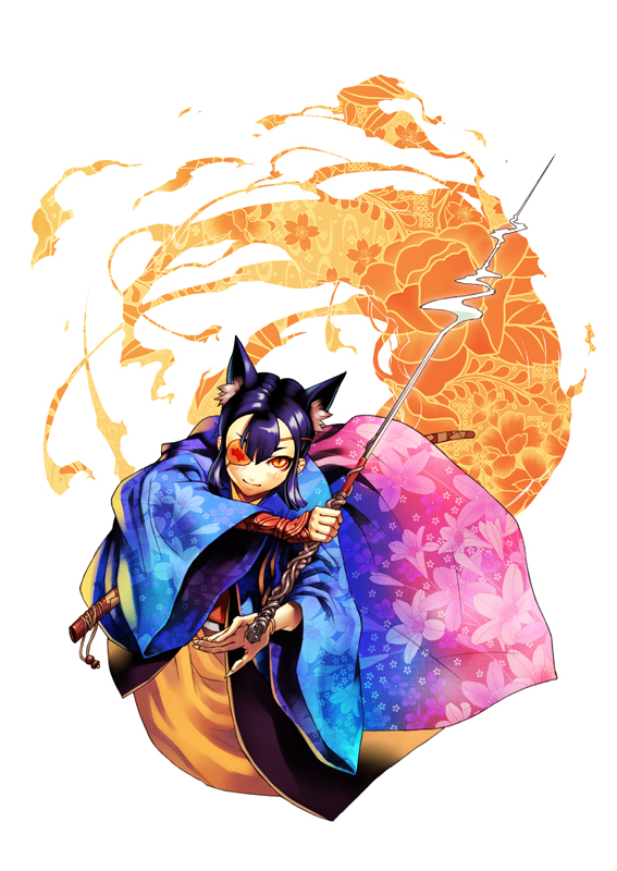1girlanimal earseyepatchfemale focusfirefox earsjapanese clotheskimonomagicsoloswordweaponyellow eyes