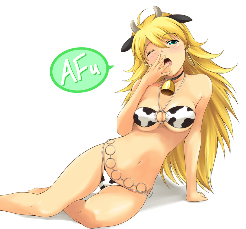 00s1girlanimal earsanimal printarm supportbandeaubandeau bikinibellbikiniblonde hairblushbreastschain beltcleavagecollarcow girlcow printcowbellearringsfemale focushalterneckhornsjewelrylarge breastslong hairnavelneck bellnew yearo-ringo-ring topone eye closedopen mouthshadowsittingsolostring bikiniswimsuityawningyokozuwari