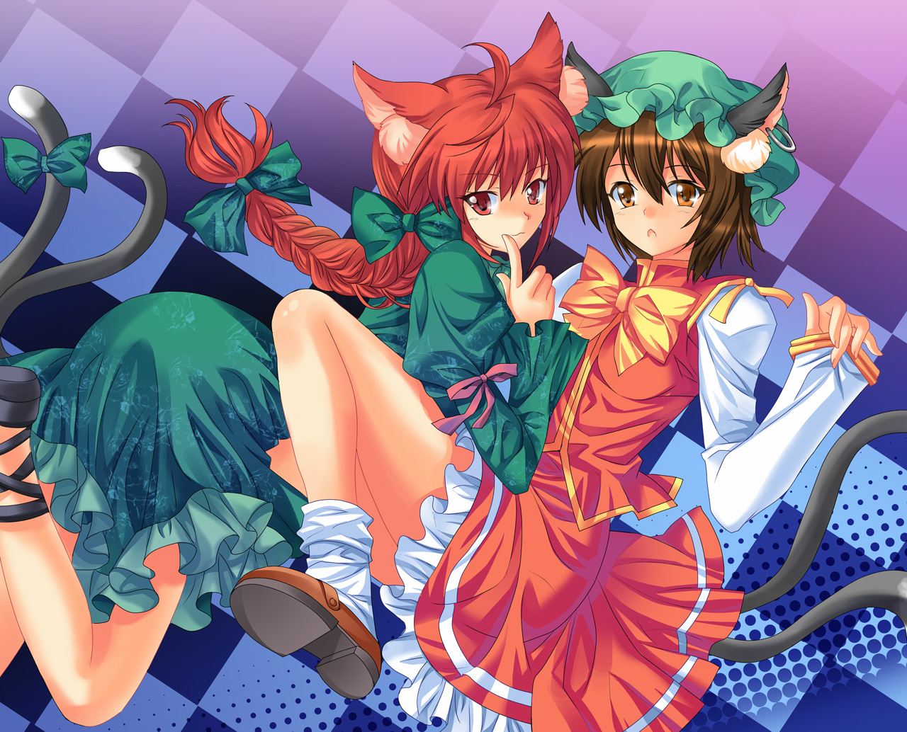 2girlsahogeanimal earsbowbraidbrown eyesbrown haircat earscat girlcat tailfemale focushair bowhatmultiple girlsred eyesred hairtailtwin braids