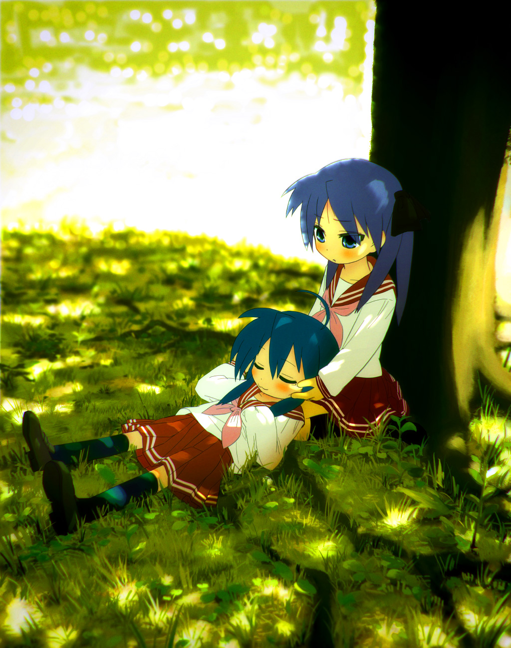 00s2girlsahogeblurrydappled sunlightdepth of fieldlap pillowlyingmultiple girlsnatureoutdoorsschool uniformserafukusleepingsunlight