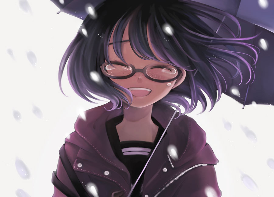 1girlclosed eyesfemale focusfrecklesglasseshappyschool uniformserafukushort hairsnowsoloumbrellawhite background