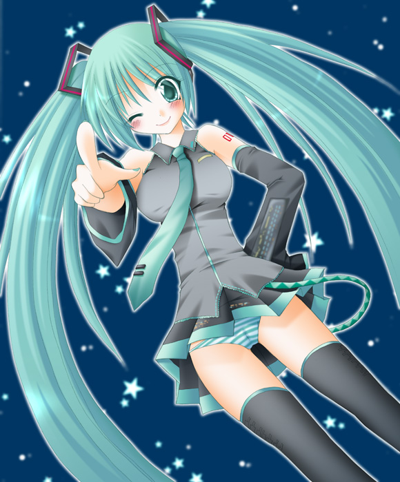 aqua eyesaqua hairblushdetached sleeveslong hairnecktieone eye closedpantiespantyshotpointingskirtsolostriped clothesstriped pantiesthighhighstwintailsunderwearvery long hairwink