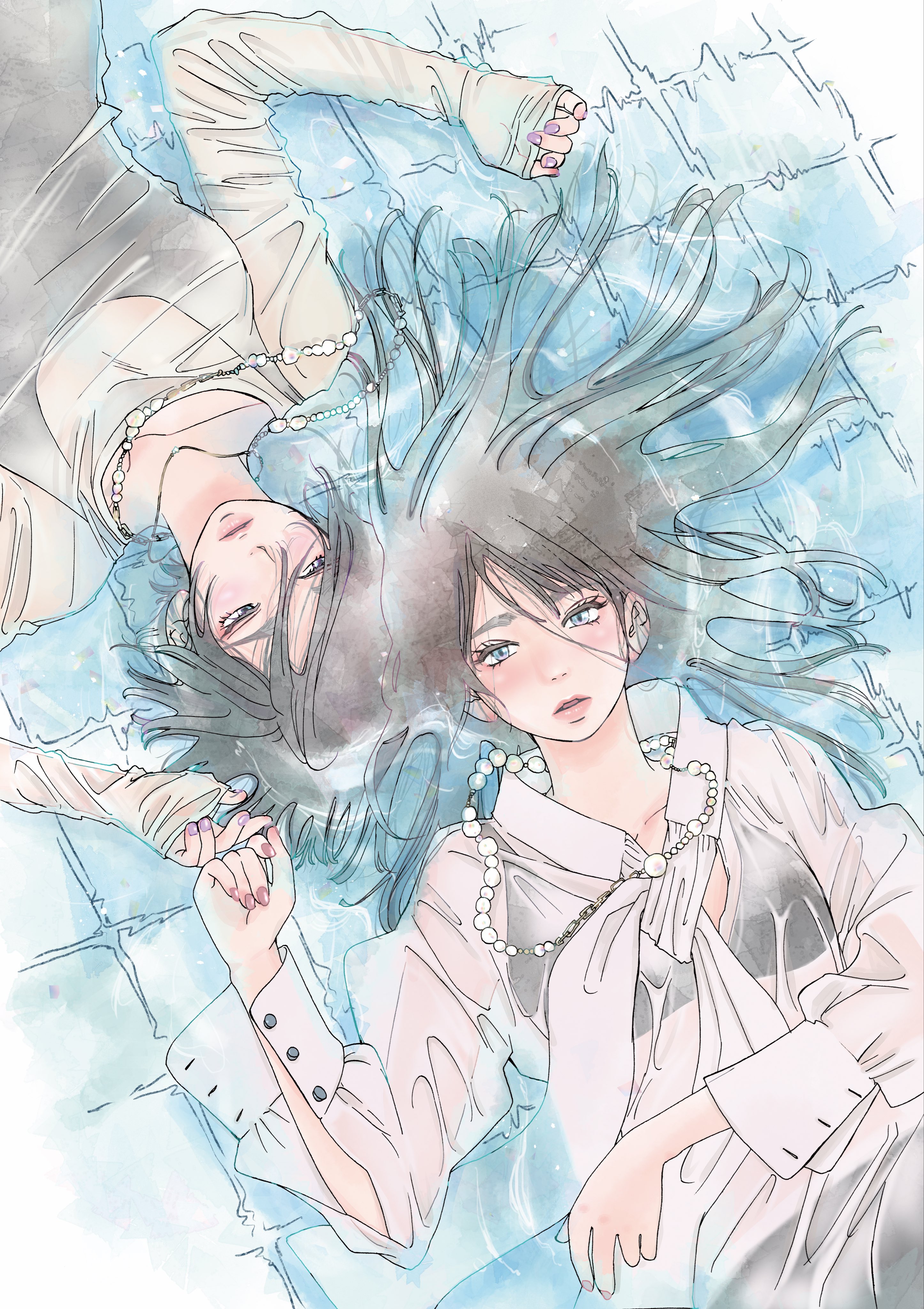 2girlsblack hairbra visible through clothesin waterjewelrylong hairlyingmultiple girlsnail polishnecklaceshort hairtsumetakute yawarakaupper bodyupside-down