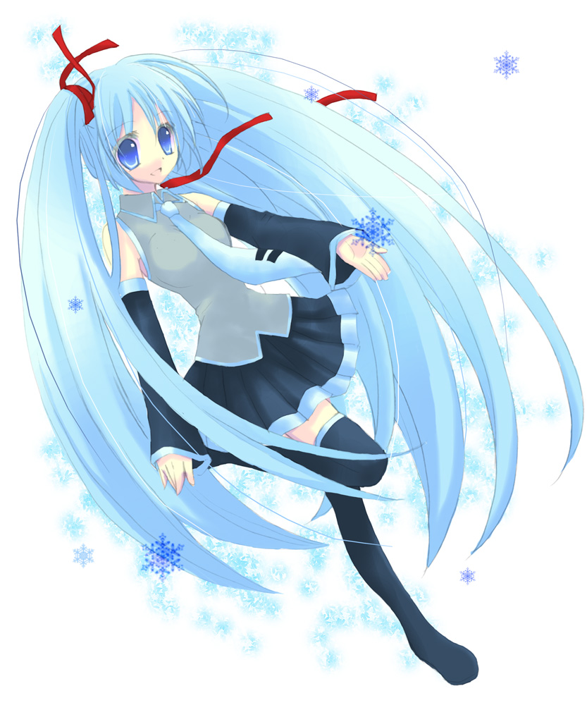 blue eyesblue hairdetached sleeveslong hairnecktieskirtsnowflakessolothighhighstwintailsvery long hair