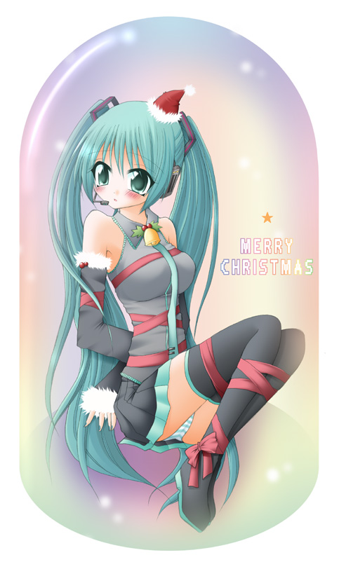 1girlaqua eyesaqua hairbdsmbellbondageboundchristmasdetached sleevesfemale focushatheadsethollylong hairnecktiepantiespantyshotribbonribbon bondagesanta hatskirtsolostriped clothesstriped pantiesthighhighstwintailsunderwearupskirtvery long hair