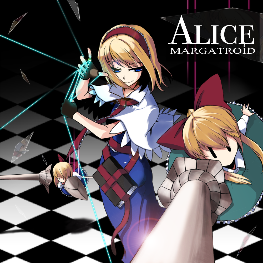 3girlsblonde hairblue eyesbookbroken glasscheckered floordollfemale focusfloorglassgloveshairbandmultiple girlsoyajigusaribbonshort hairsmilesolostanding