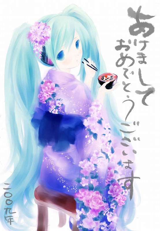 00s2009blue eyesblue hairchopsticksflowerfoodfurisodejapanese clotheskimonolong hairlooking backnew yearsittingsolotwintailsvery long hair