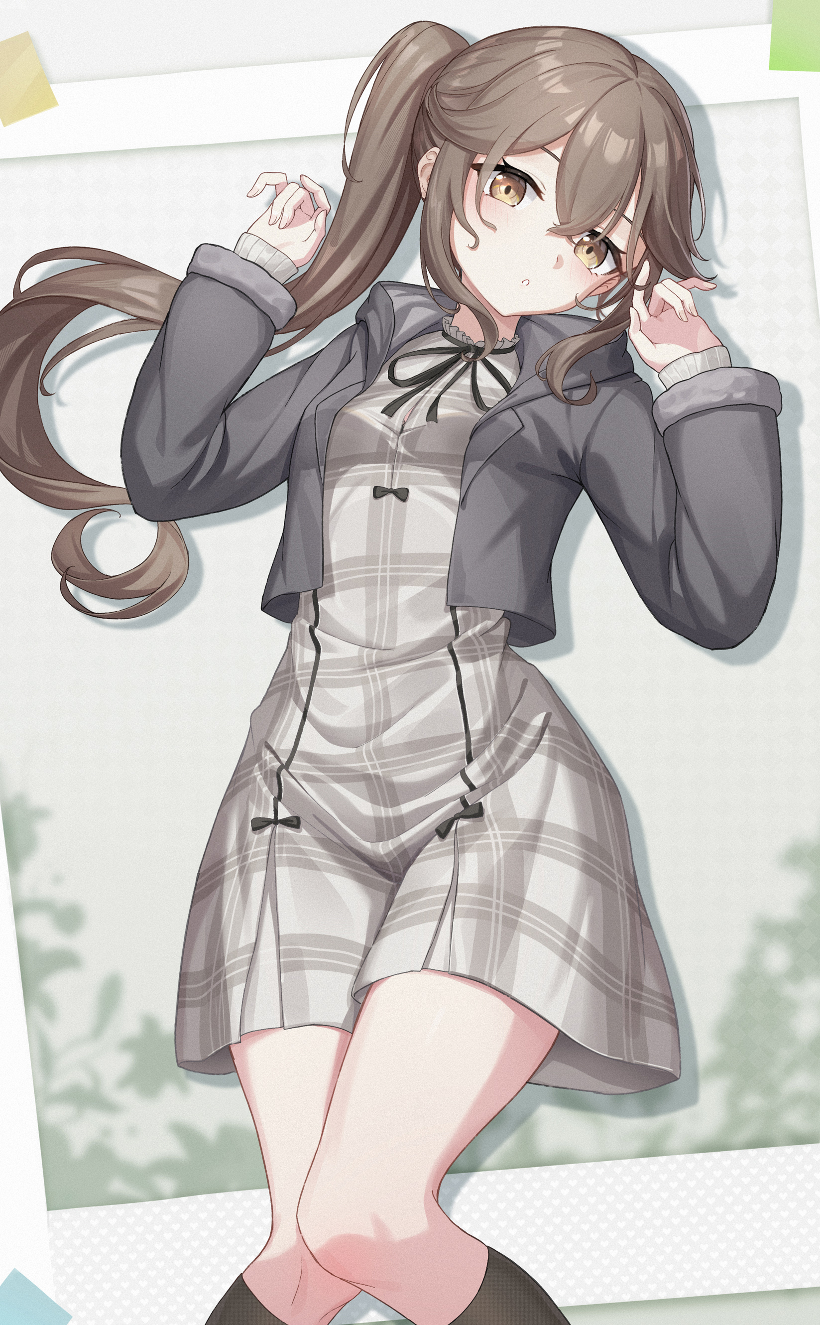 1girlblack ribbonblushbreastsbrown eyesbrown hairbrown sockscoatcropped coatdressfur trimfur-trimmed coathair between eyeslong hairlong sleeveslooking at viewerlyingneck ribbonopen clothesopen coatparted lipspicture frameplaid clothesplaid dressponytailribbonshadowsmall breastssockssolotapethighs