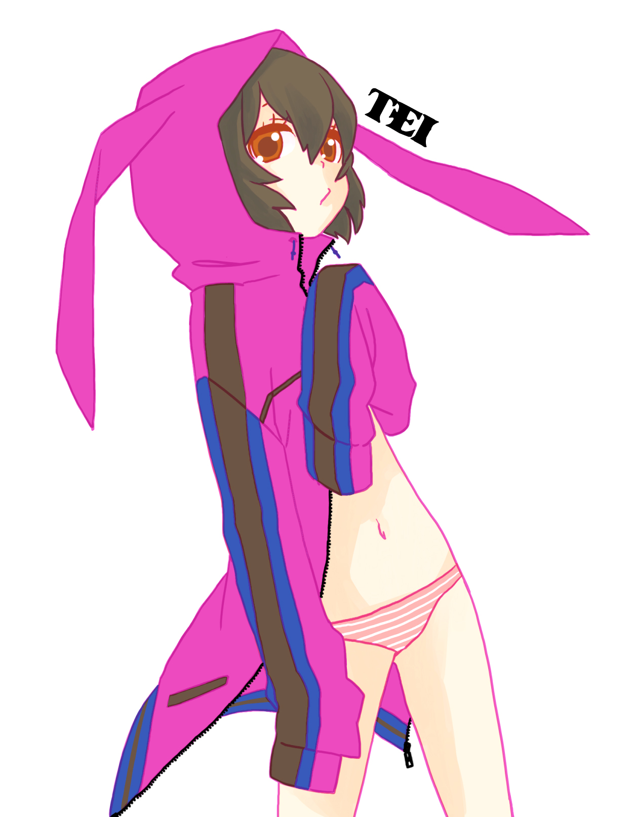 1girlfemale focushoodhooded jacketjacketlong sleevesno pantsopen clothesopen robeoversized clothespantiesred eyesrobeshort hairsolostriped clothesstriped pantiesunderwear