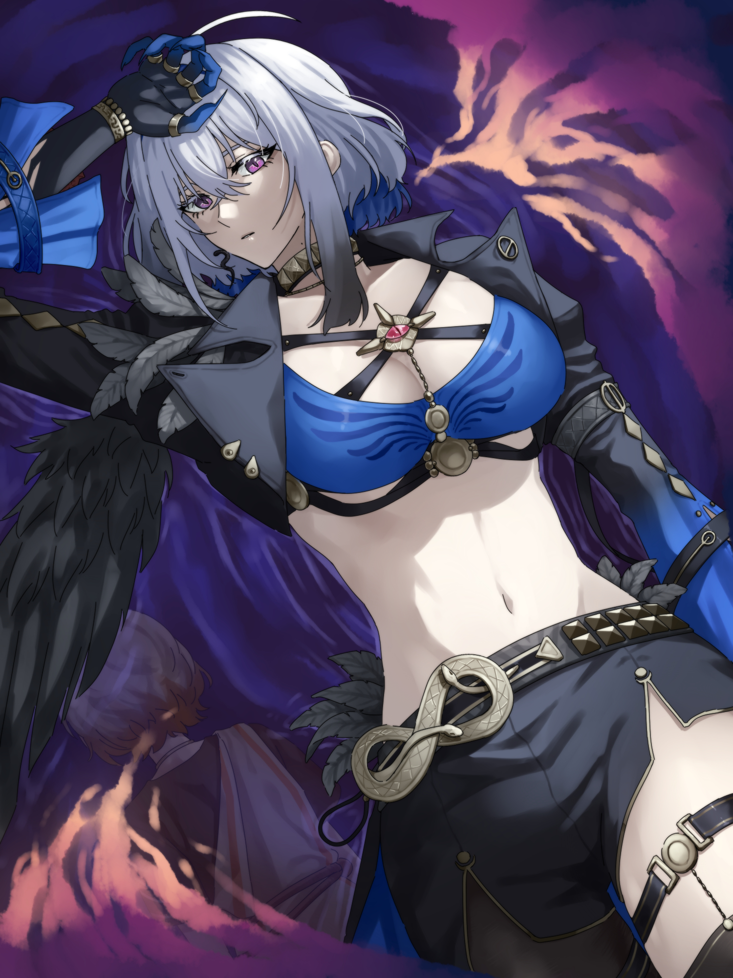 1girlarm upblack jacketblack pantyhoseblack shortsblue brablue hairbrabreastscolored inner haircropped jacketgold chokergrey hairhair between eyesjacketjewelrylarge breastslooking at viewermulticolored hairmutationnavelpantyhoseparted lipspurple eyesshortssingle leg pantyhosesolostomachthighletthighsunderwearvery long fingernails