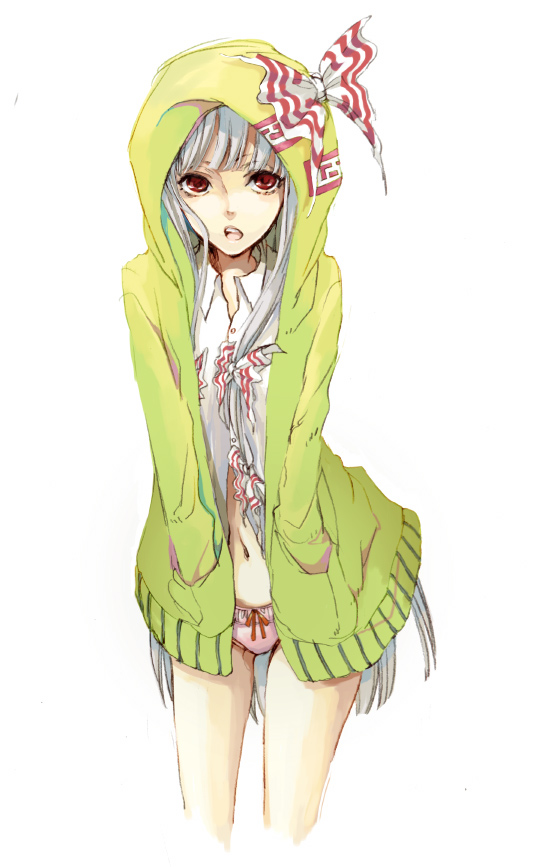 1girlbowfemale focushoodhooded jacketjacketlong hairnavelpantiespink pantiesred eyesshirtsolounderwearwhite hair