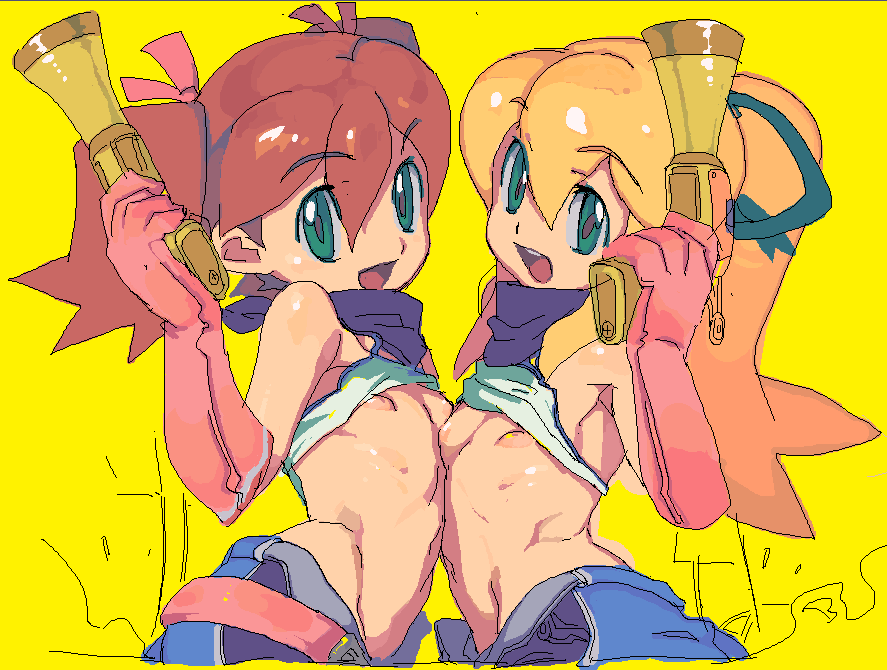 2girlsbeltblonde hairbreast pressclothes liftcrossoverelbow glovesflat chestglovesgreen eyesgroingunhair ribbonlolilong hairmidriffmultiple girlsnipplesoekakiopen flyponytailred hairribbonscarfshirt liftshort twintailssymmetrical dockingtwintailsunzippedweapon