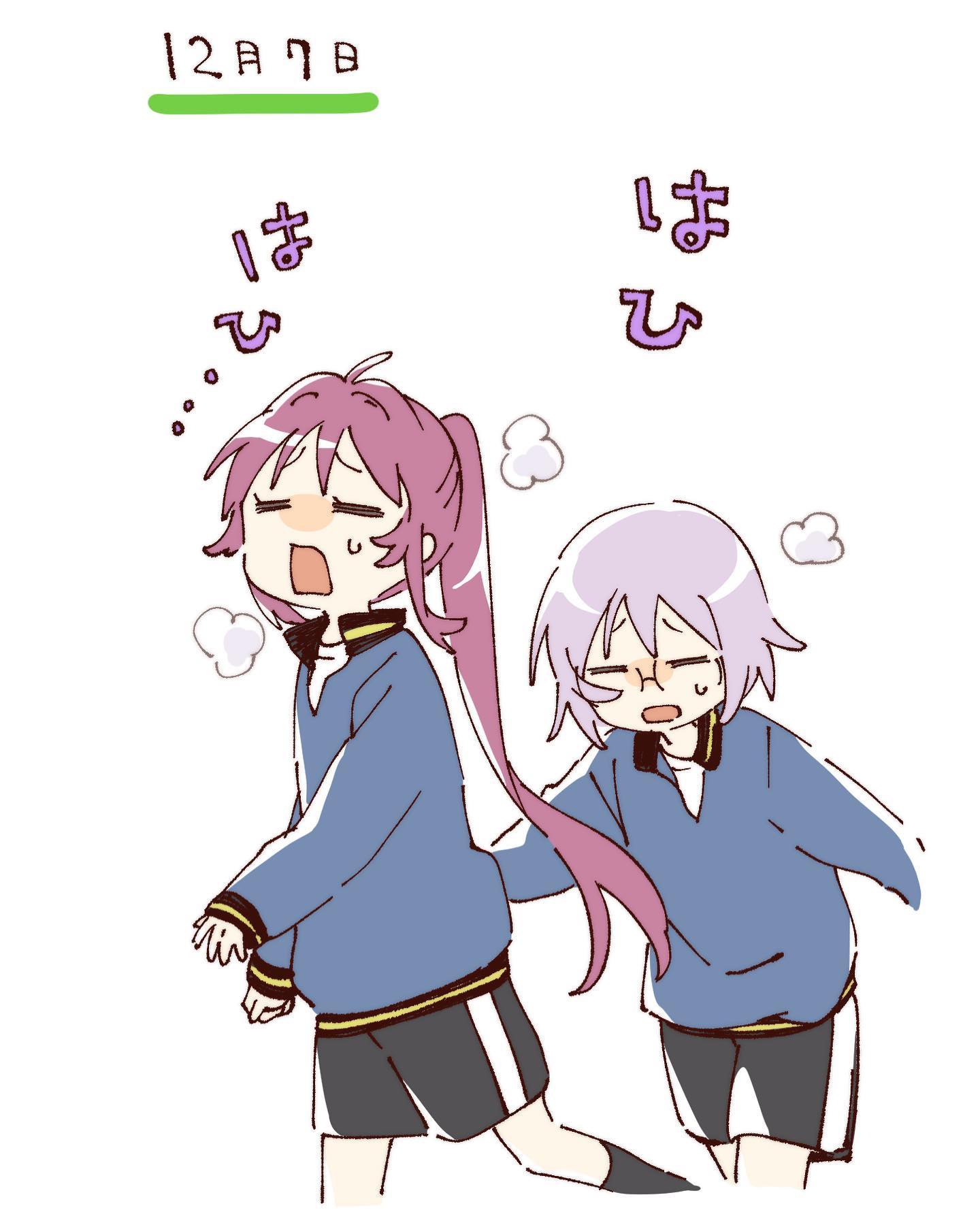 1boy2girlsahogeblack shortsblack socksblue shirtcropped legsexhaustedfurrowed browglassesgrey hairgym uniformlong hairlong sleevesmultiple girlsopen mouthponytailpurple hairrunningshirtshort hairshortssimple backgroundsockssweatdropwhite background