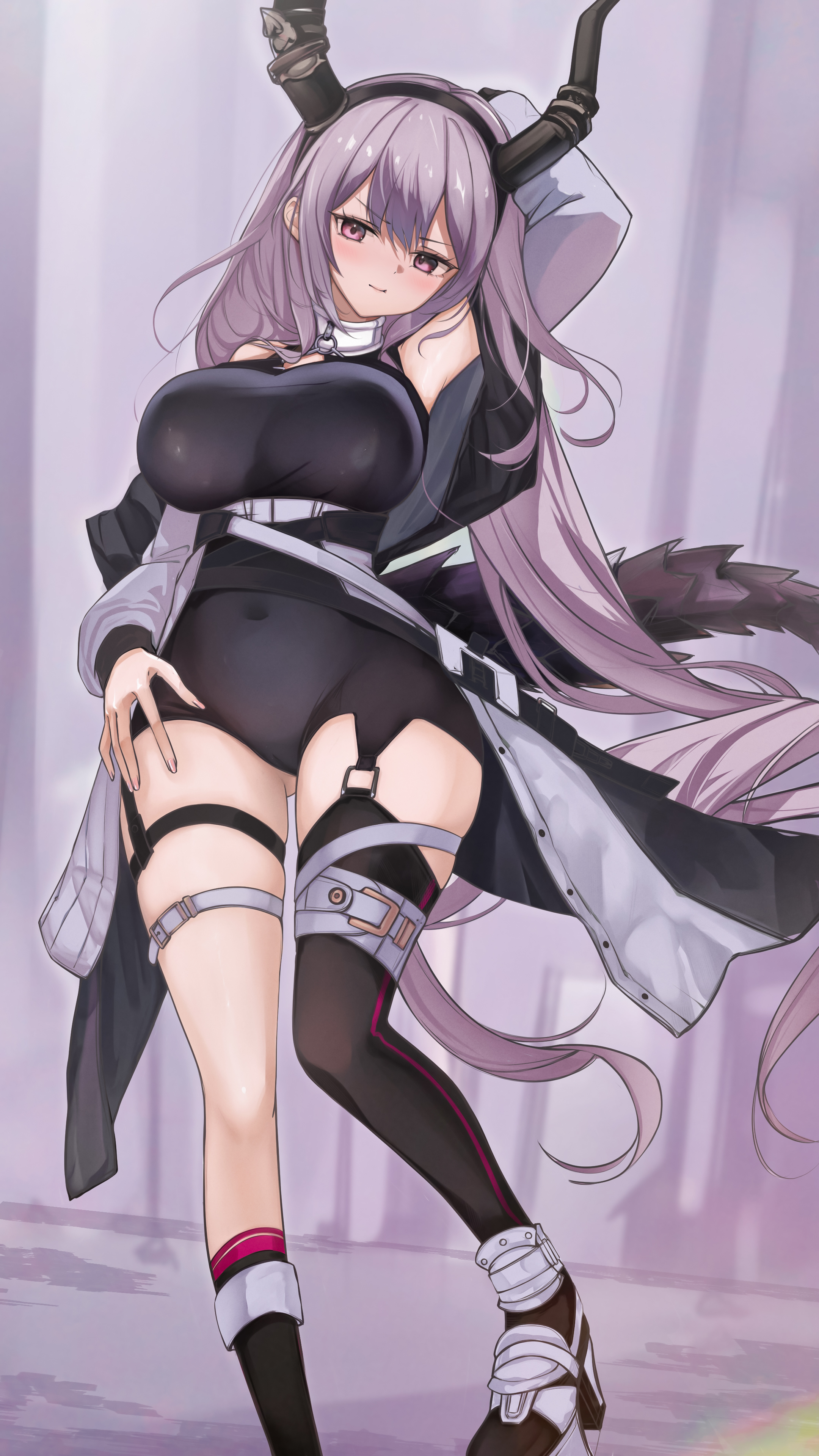 1girlarm upasymmetrical legwearbeltblack hornsblack shoesblack socksblack thighhighsblack unitardbreastscoatcovered erect nipplescovered navelgrey coathornslarge breastslong hairlooking at vieweroff shoulderpurple eyespurple hairshoesskindentationsockssolostandingthigh beltthigh strapthighhighsvery long hair