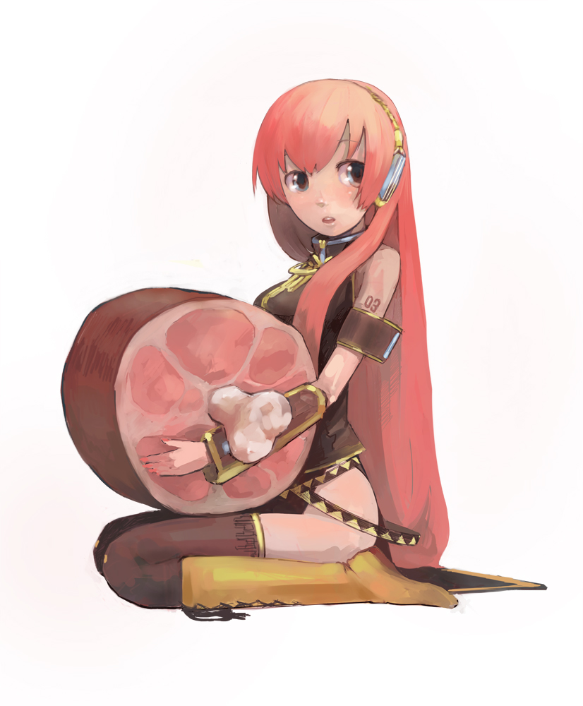 1girlblushboned meatbootsfemale focusfoodheadphoneskneelinglong hairmeatpink hairsimple backgroundsittingsolothighhighsvery long hair