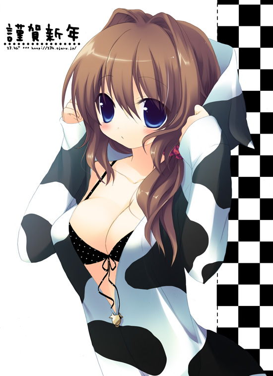 1girlanimal printbikiniblue eyesblushbrabreastsbrown haircleavagecow printfemale focusfront-tie tophoodlarge breastslingerielong hairnew yearsolostring bikiniswimsuitunderwear