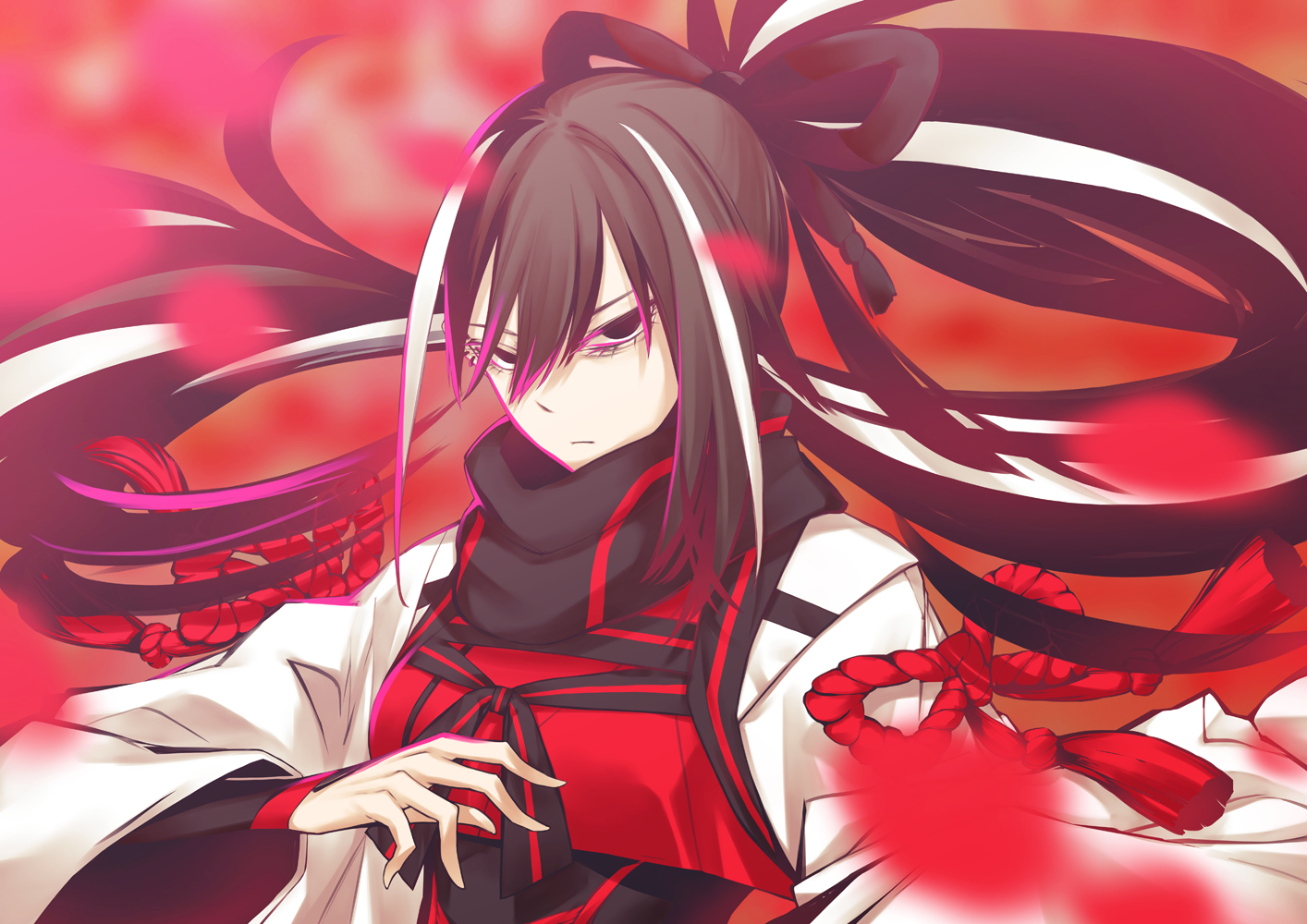 1girlblack eyesblack hairblack scarfjapanese clotheskawakami gensai (first ascension) (fate)long hairlong sleeveslooking at viewermulticolored hairponytailscarfsoloupper bodywhite hair