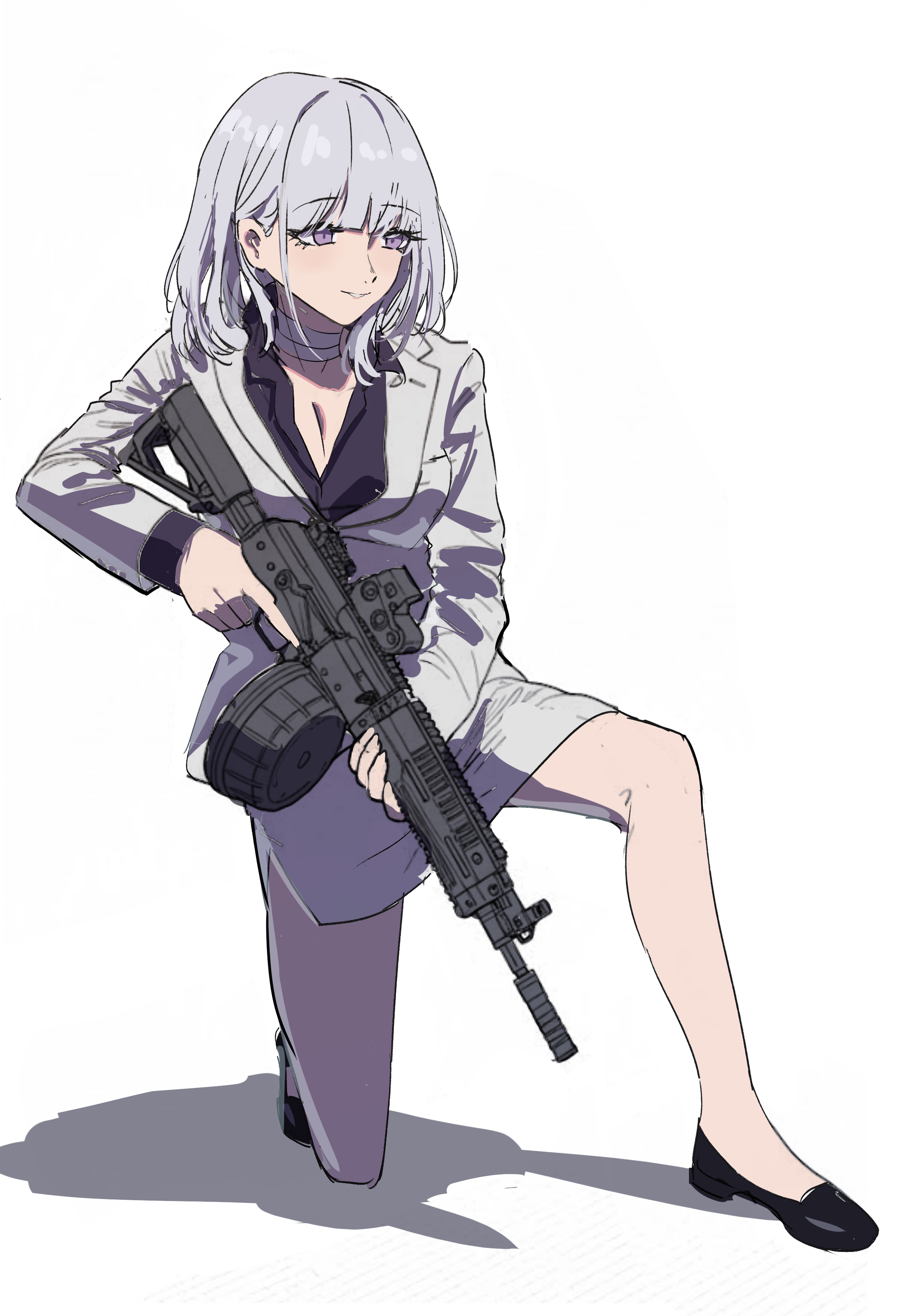 1girlbandaged neckbandagesblack shirtblack shoesbreastscleavagecollared shirtdrum magazinefull bodygunholdingholding gunholding weaponjacketlight machine gunlight smilemachine gunmagazine (weapon)medium hairoffice ladyofficial alternate costumeon one kneeparted lipspencil skirtpurple eyesrpk-16shirtshoessimple backgroundskirtsolotrigger disciplineweaponwhite backgroundwhite hairwhite jacketwhite skirt