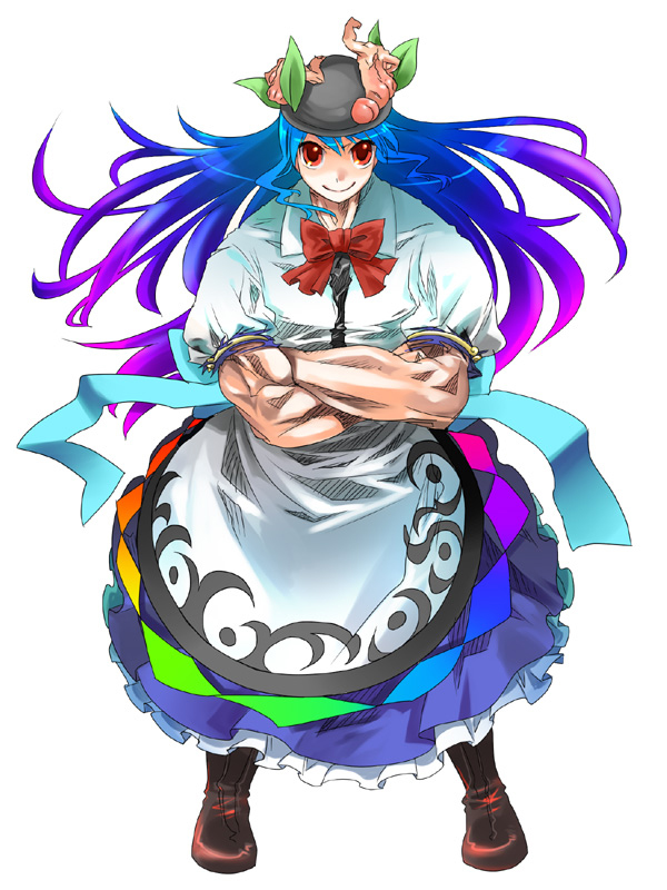 1girlblue haircrossed armsextreme musclesfemale focusflexingfoodfruitgradient hairhatlong hairmulticolored hairmuscularpeachpurple hairred eyesribbonsmilesolo