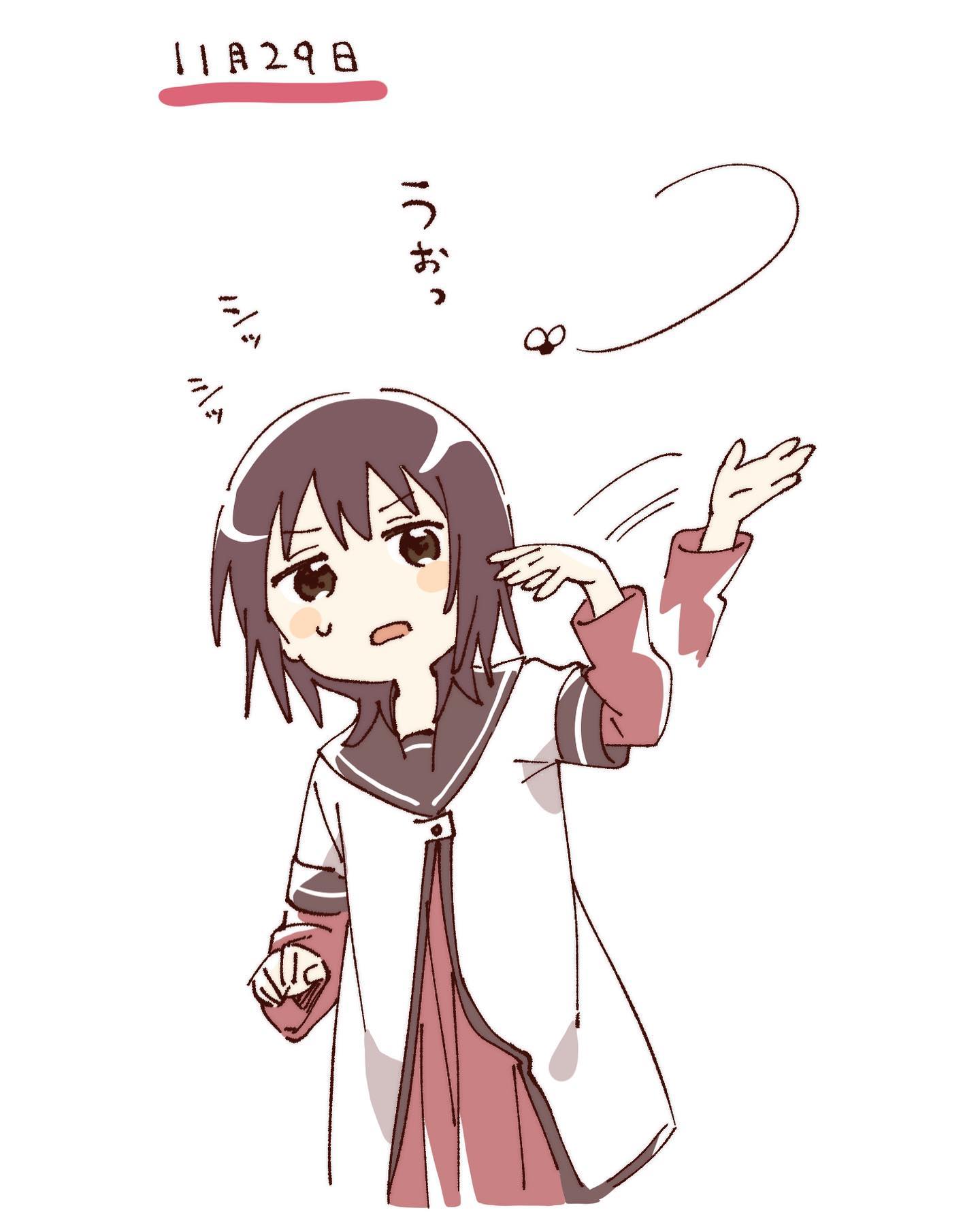 1girlafterimageblush stickersbrown eyesbrown hairbrown sailor collarbugcropped torsodressflailingflyinsectlayered sleeveslong sleevesmotion linesnanamori school uniformopen mouthpleated dressred dresssailor collarschool uniformshirtshort hairshort over long sleevesshort sleevessimple backgroundsolowhite backgroundwhite shirtwinter uniform