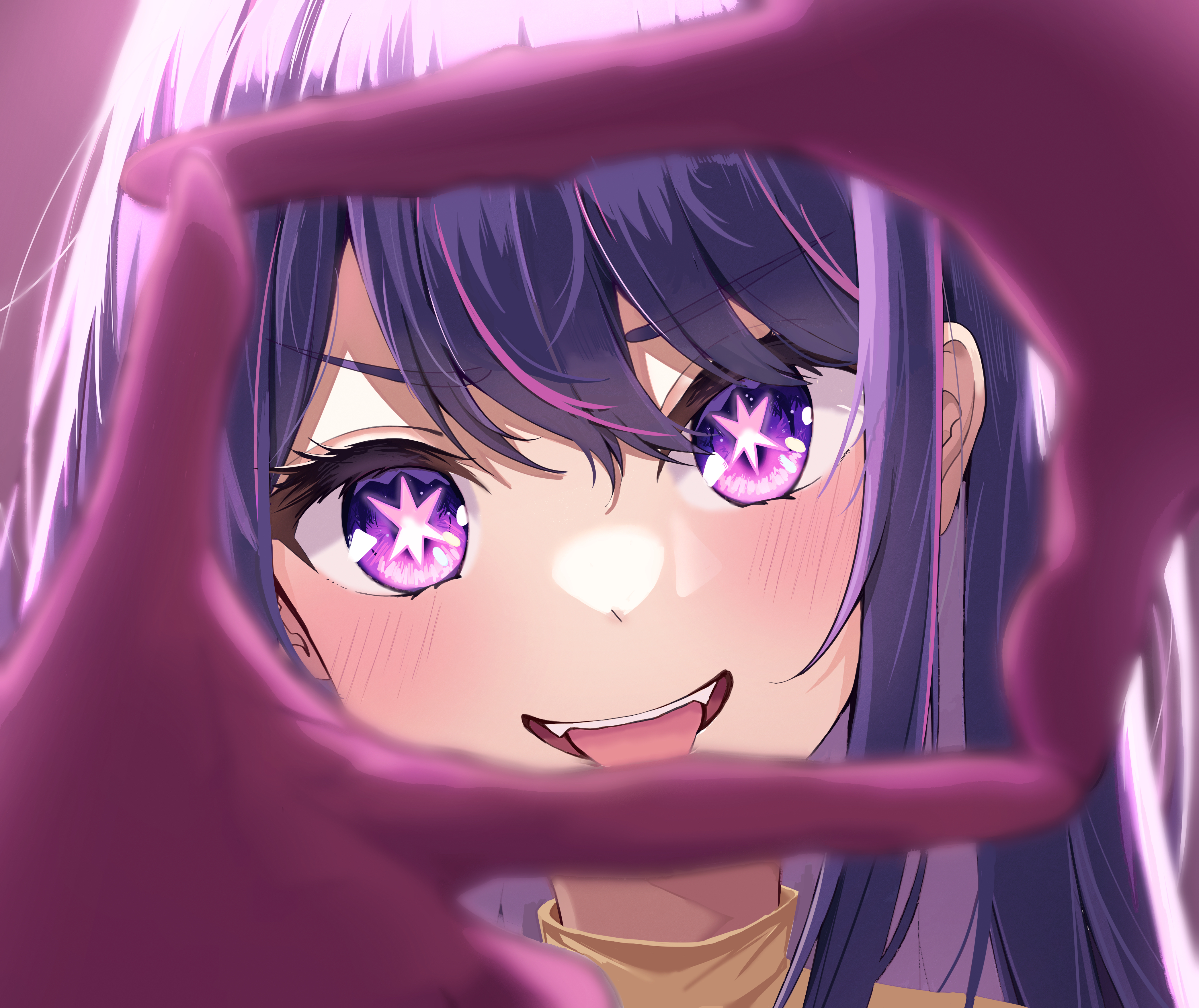1girlblurryblurry foregroundblushclose-upcolored inner hairdresseyelashesfangsfinger framegloveshead tiltlooking at viewermulticolored hairopen mouthparted bangspink glovespink hairpink streaksportraitpurple eyespurple hairsmilesolostar (symbol)star-shaped pupilsstreaked hairsymbol-shaped pupilstonguetongue outturtleneckturtleneck dress