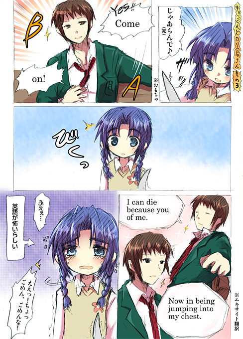 00s1boy1girlaged downbraidcomicenglish textengrish textkniferanguageschool uniformsweater vesttwin braidswavy mouthyaranaika
