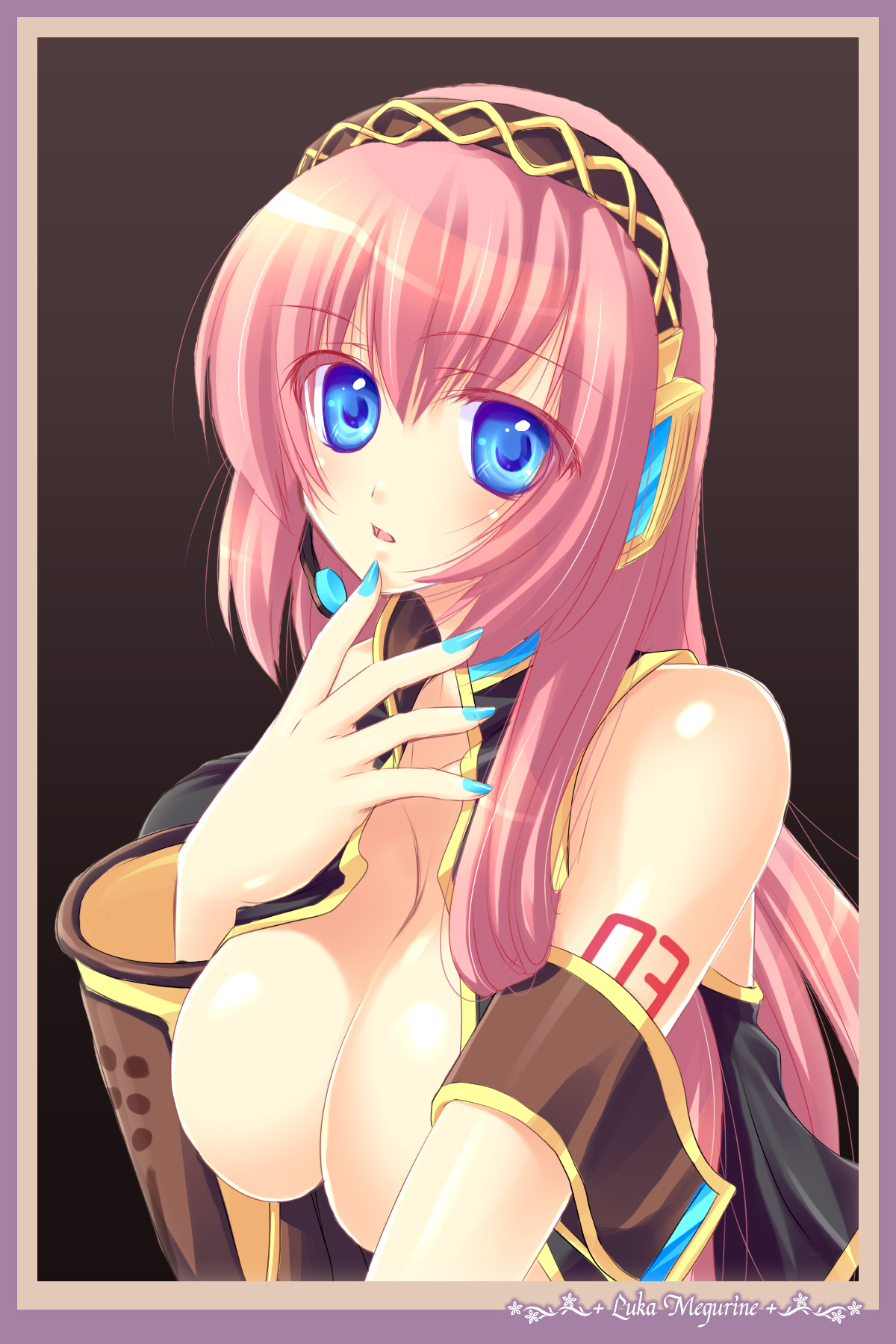 1girlbare shouldersblue eyesblue nailsbreastsbreasts squeezed togetherfemale focusheadsethuge breastslong hairnail polishpink hairsolo