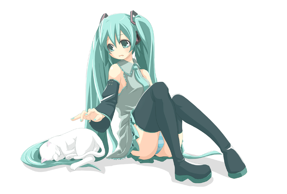 1girlaqua eyesaqua haircatdetached sleevesfemale focuslong hairnail polishnecktiepantiespantyshotsittingskirtsolostriped clothesstriped pantiesthighhighstwintailsunderwearvery long hair
